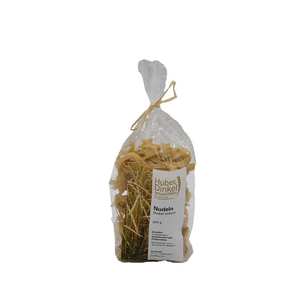 Die Nudeln werden mit dem eigenen Dinkelmehl hell oder dunkel (Urkorn) und den Eier von den Hühner vom Tannenhof selber hergestellt.